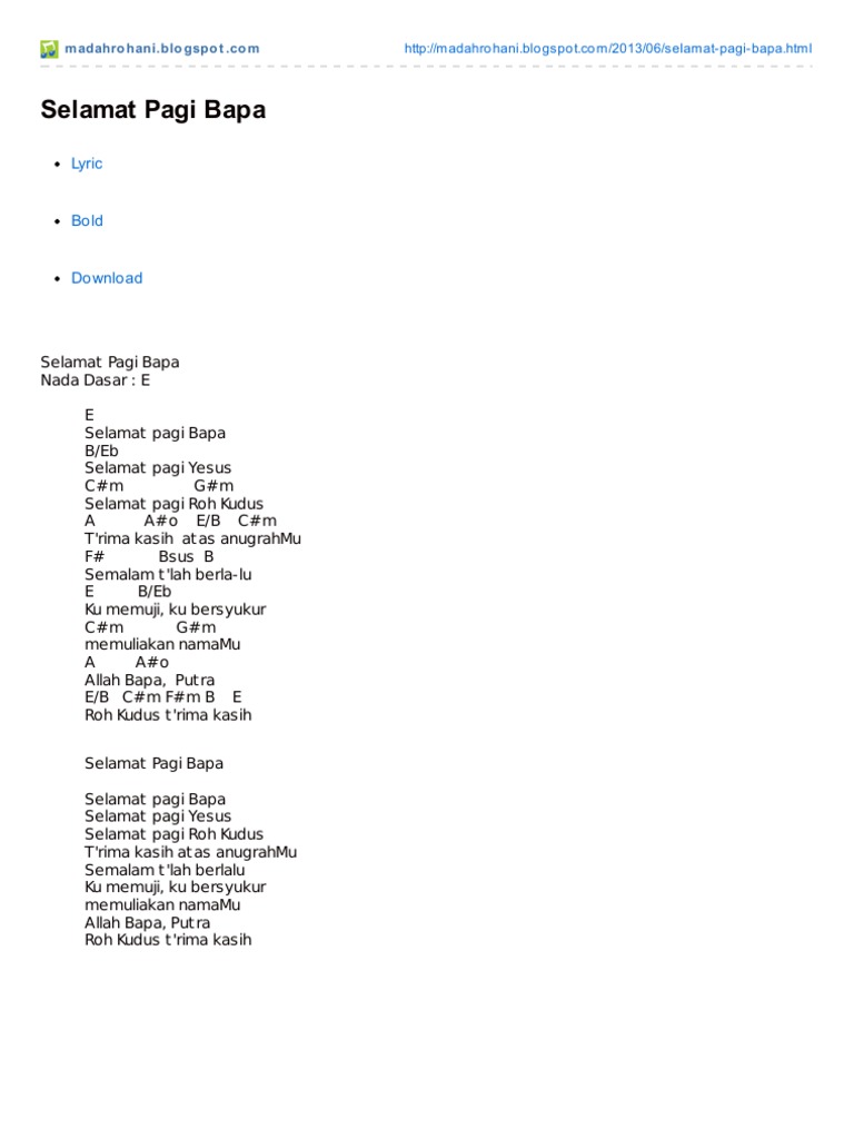 Verse F Selamat Pagi Bapa CE Selamat Pagi Yesus Dm Am Selamat Pagi Roh Kudus Bb GB FC Dm Trima Kasih Atas AnugrahMu G C Semalam Tlah Berlalu Chorus F Ku Memuji CE Ku Bersyukur Dm Am Memuliakan NamaMu Bb GB FC Dm Allah Bapa Putra Roh Kudus Gm C F Trima. Kata ucapan selamat pagi Kristen tentu akan lebih menarik apabila disertai dengan gambar. Download lagu Selamat Pagi Bapa Mp3 gratis dalam format MP3 dan MP4.