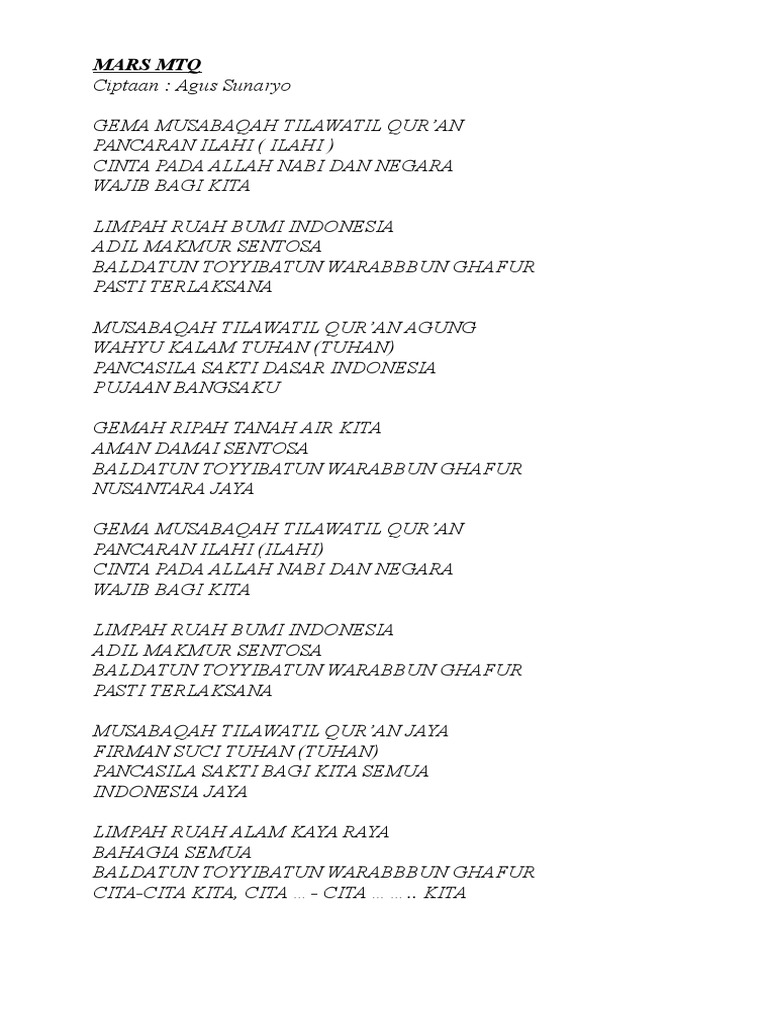 Untuk mendengarkan lagu atau melihat video clipnya belilah secara legal. Pada lagu Hymne TPQ ini lebih susah secara teknik menyanyikan karena nada yang meliuk liuk serta diperlukan bakat yang baik dalam nada dan lagu. Lagu Mars MTQ Ciptaan Agus Sunaryo Gema Musabaqah Tilawatil QuranPancaran IlahiCinta pada Allah Nabi dan NegaraWajib bagi kitaLimpah ruah bumi IndonesiaAdil makmur sentosaBaldatun thayyibatun warabbun ghafurPasti terlaksanaMusabaqah Tilawatil Quran AgungWahyu kalam TuhanPancasila sakti dasar IndonesiaPujaan bangsakuGemah ripah tanah air kitaAman.