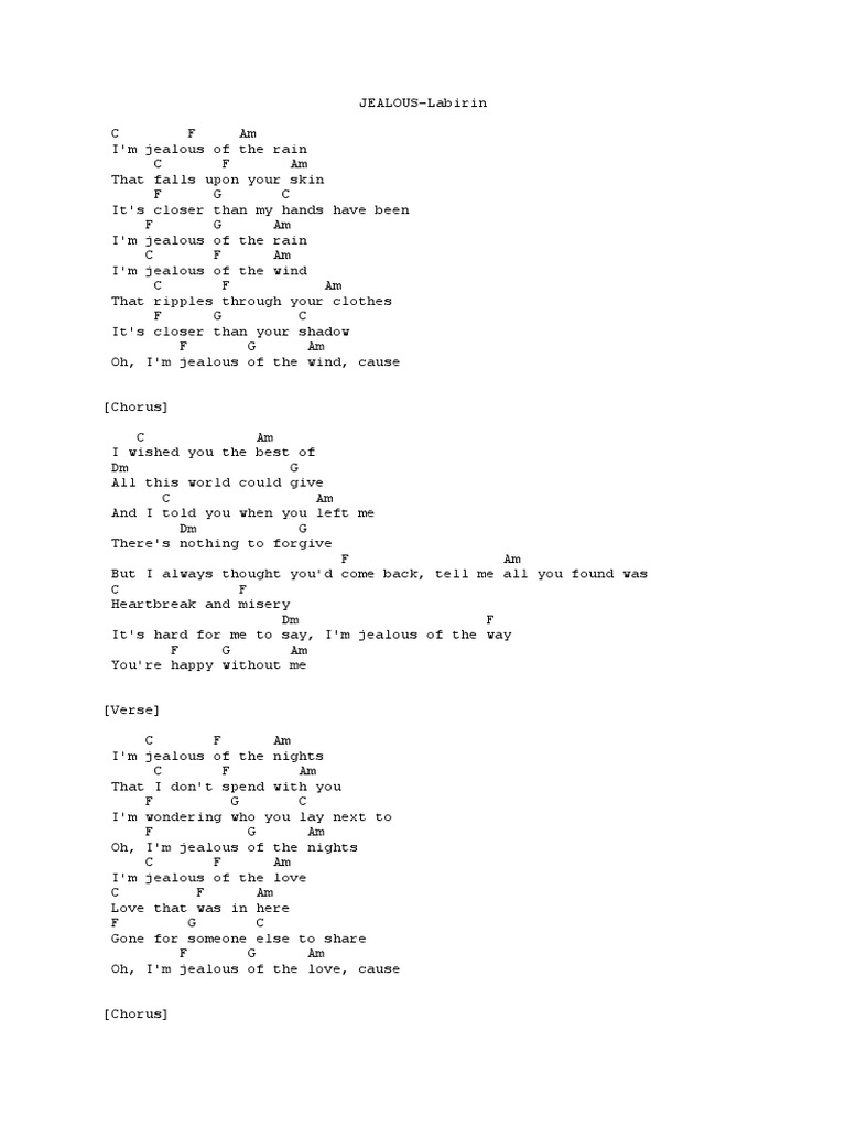 Berikut cuplikan syair nyanyian teks dari lagunya. Chords for Labrinth - Jealous. We have an official Jealousy Jealousy tab made by UG professional guitarists.