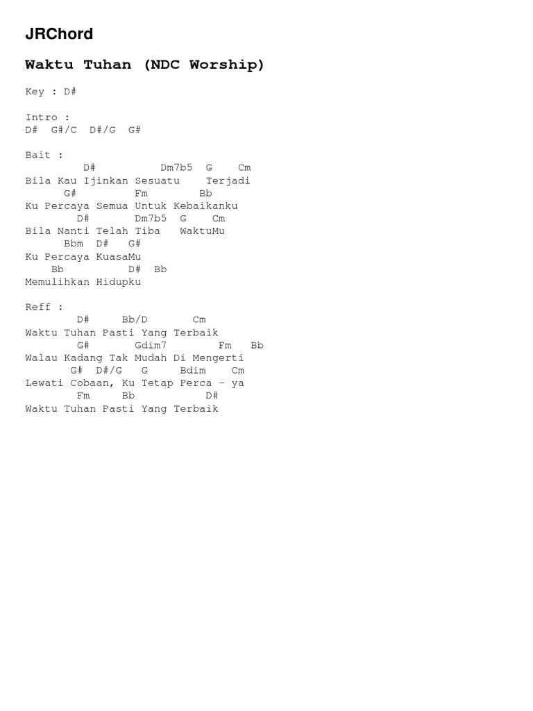 Senin 2 Agustus 2021 2347. Waktu Tuhan pasti yang terbaik Walau kadang tak mudah di mengerti Lewati cobaan ku tetap percaya Waktu Tuhan pasti yang terbaik. E BD Cm B Tuhan Pasti Sanggup A Fm B Tangan-Nya Tak Kan Terlambat Tuk MengangkatMu E Gm Cm AmC Tuhan Masih Sanggup EB Fm B E Percayalah.